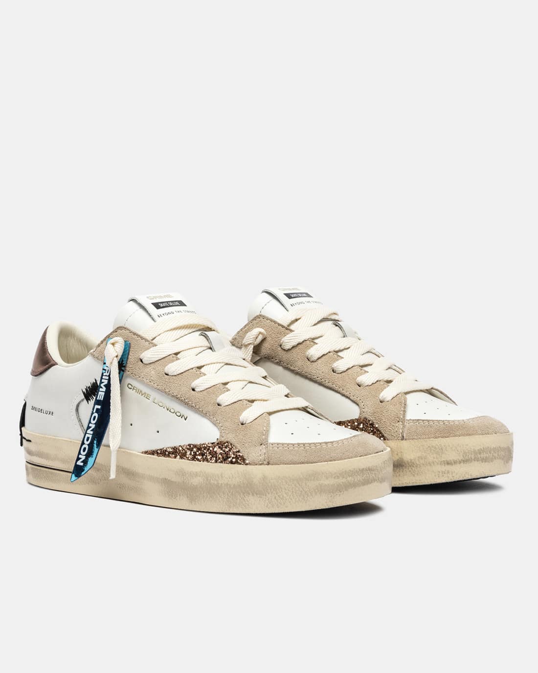 • Tomaia in pelle bianco, dettagli in suede beige e glitter oro