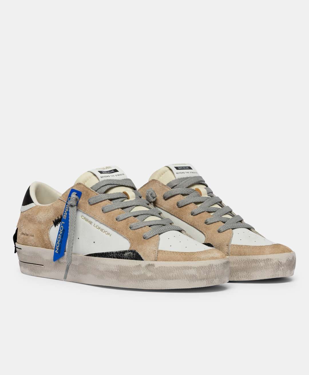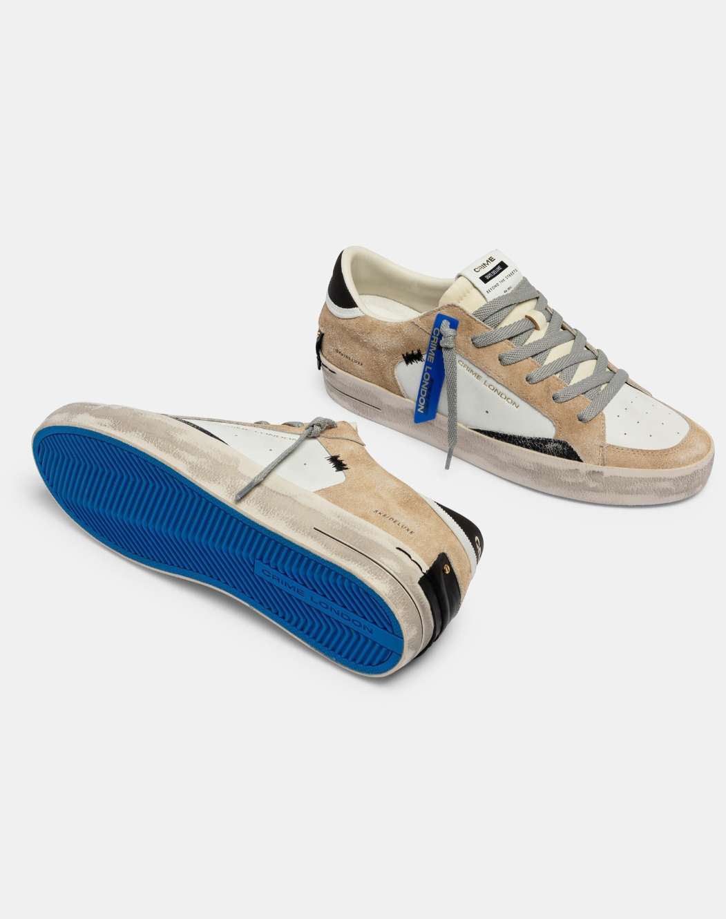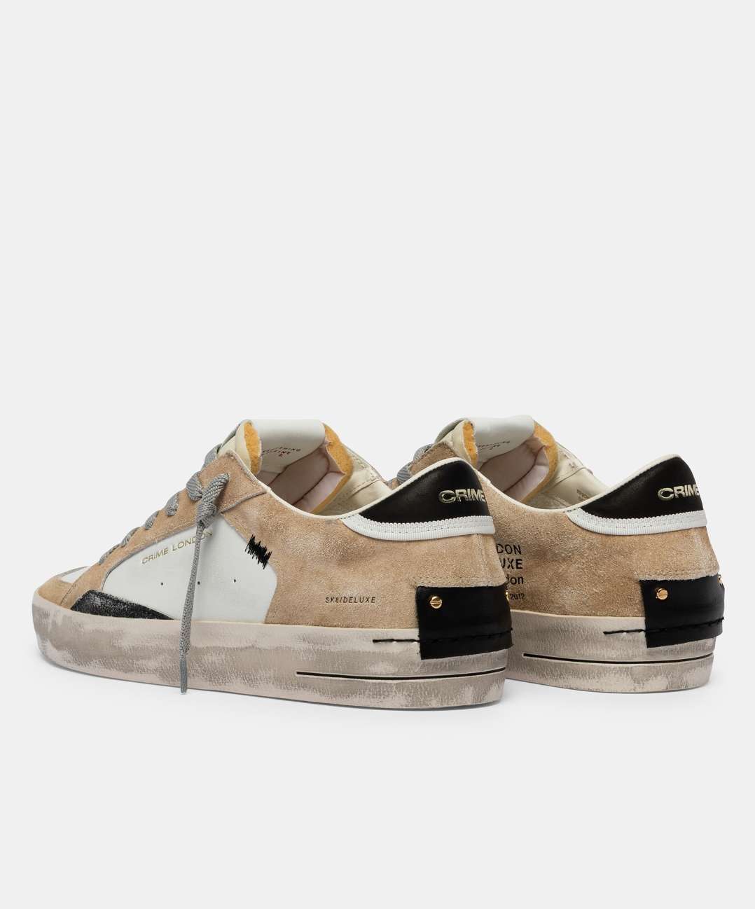• Tomaia in pelle e suede bianca e ecrù, dettagli in cracklé nero