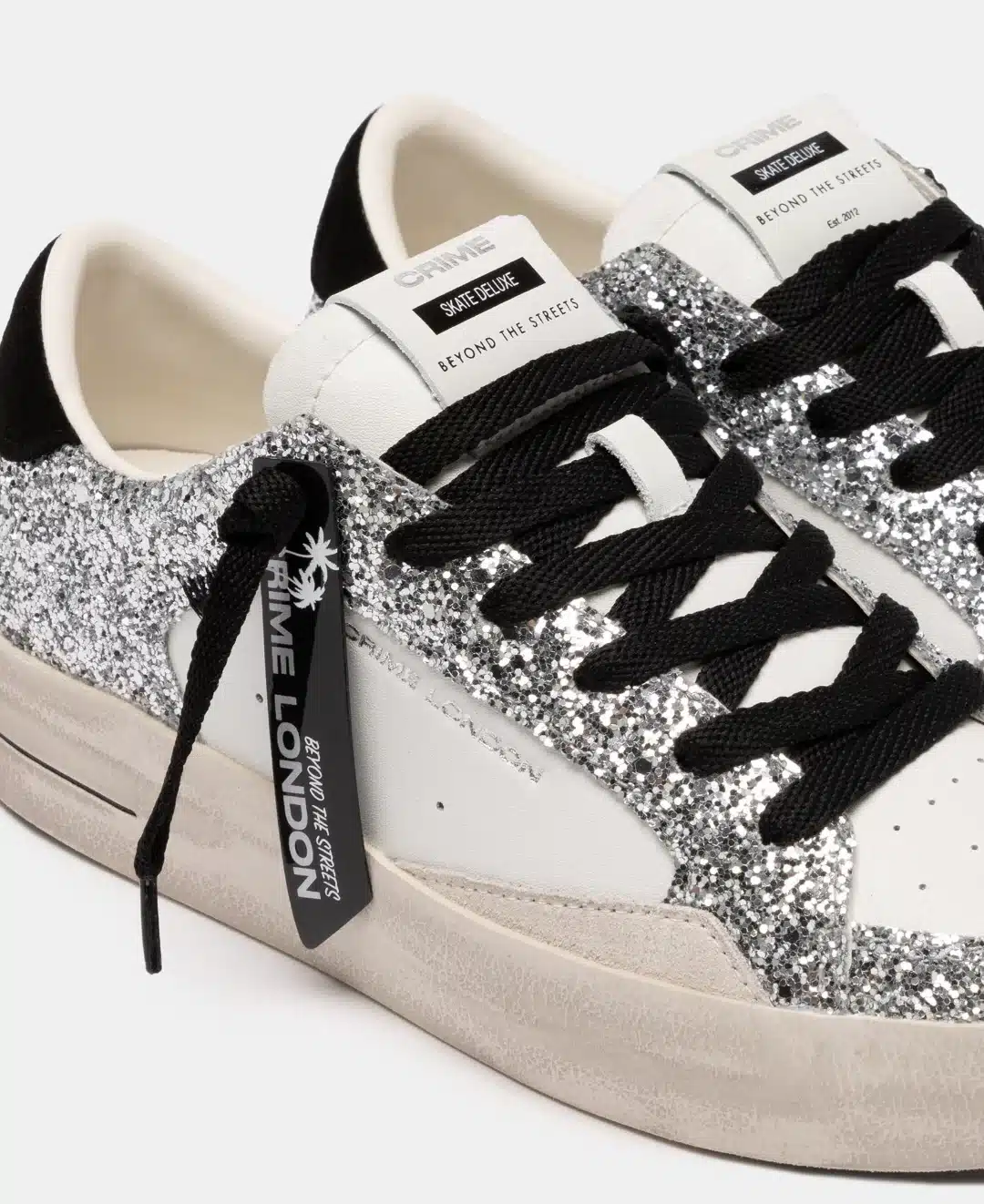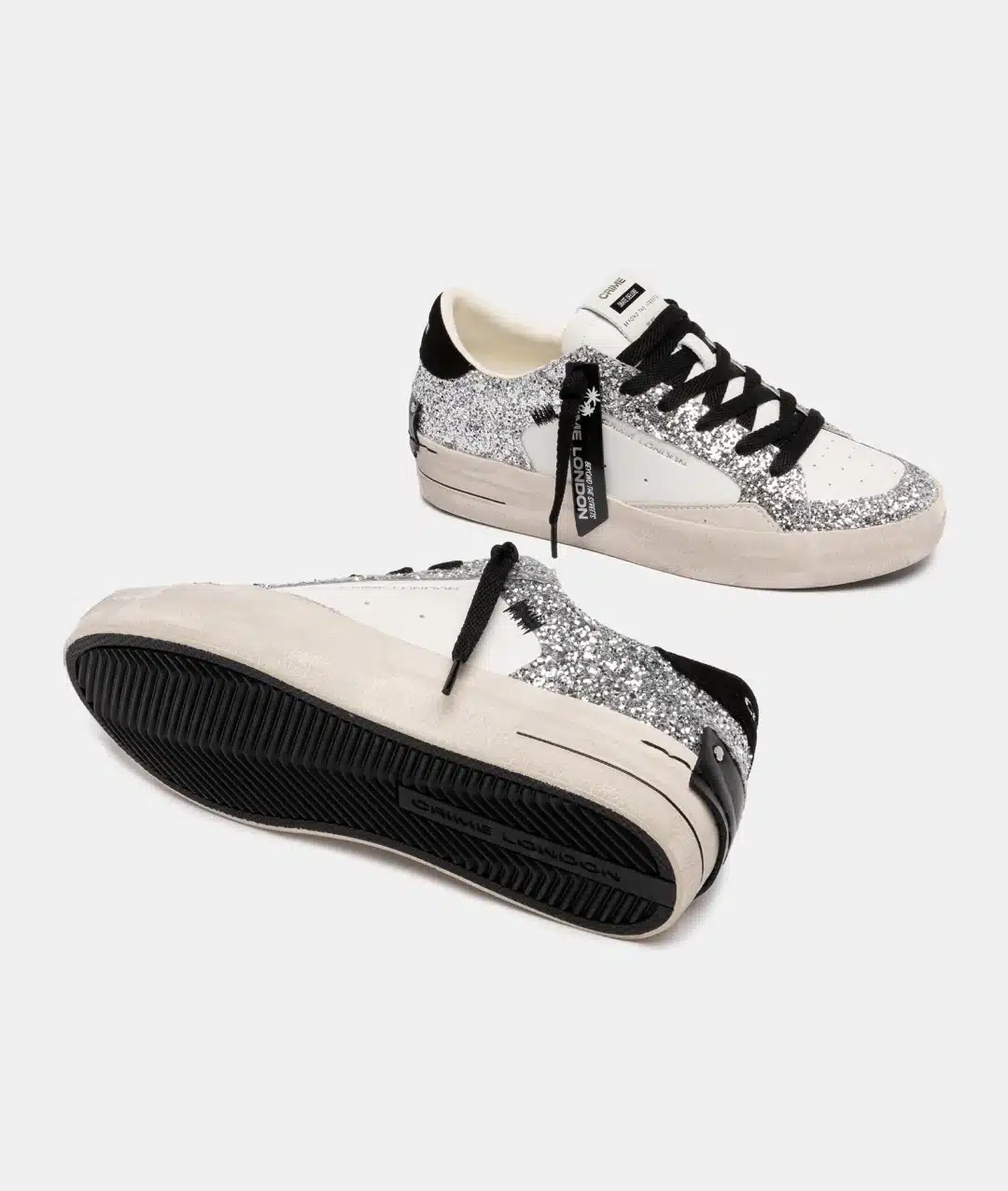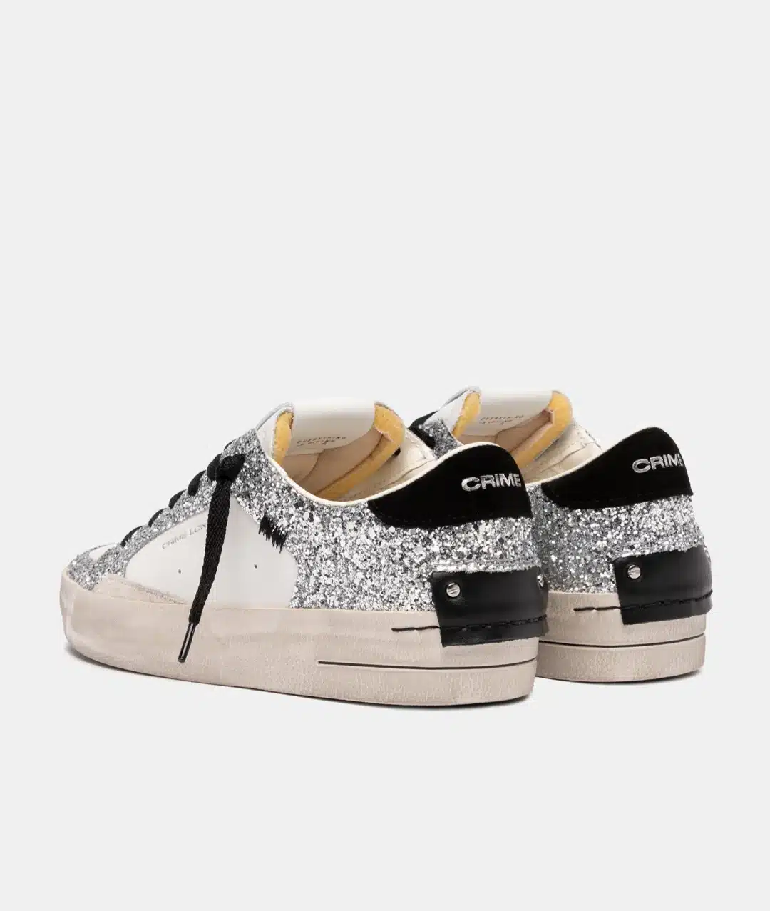 • Tomaia in pelle e glitterbianca e argento, dettagli in suede grigio chiaro