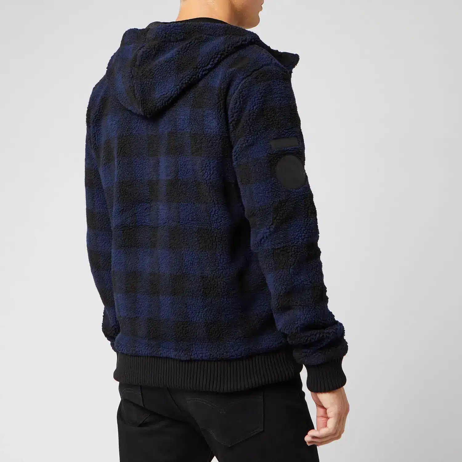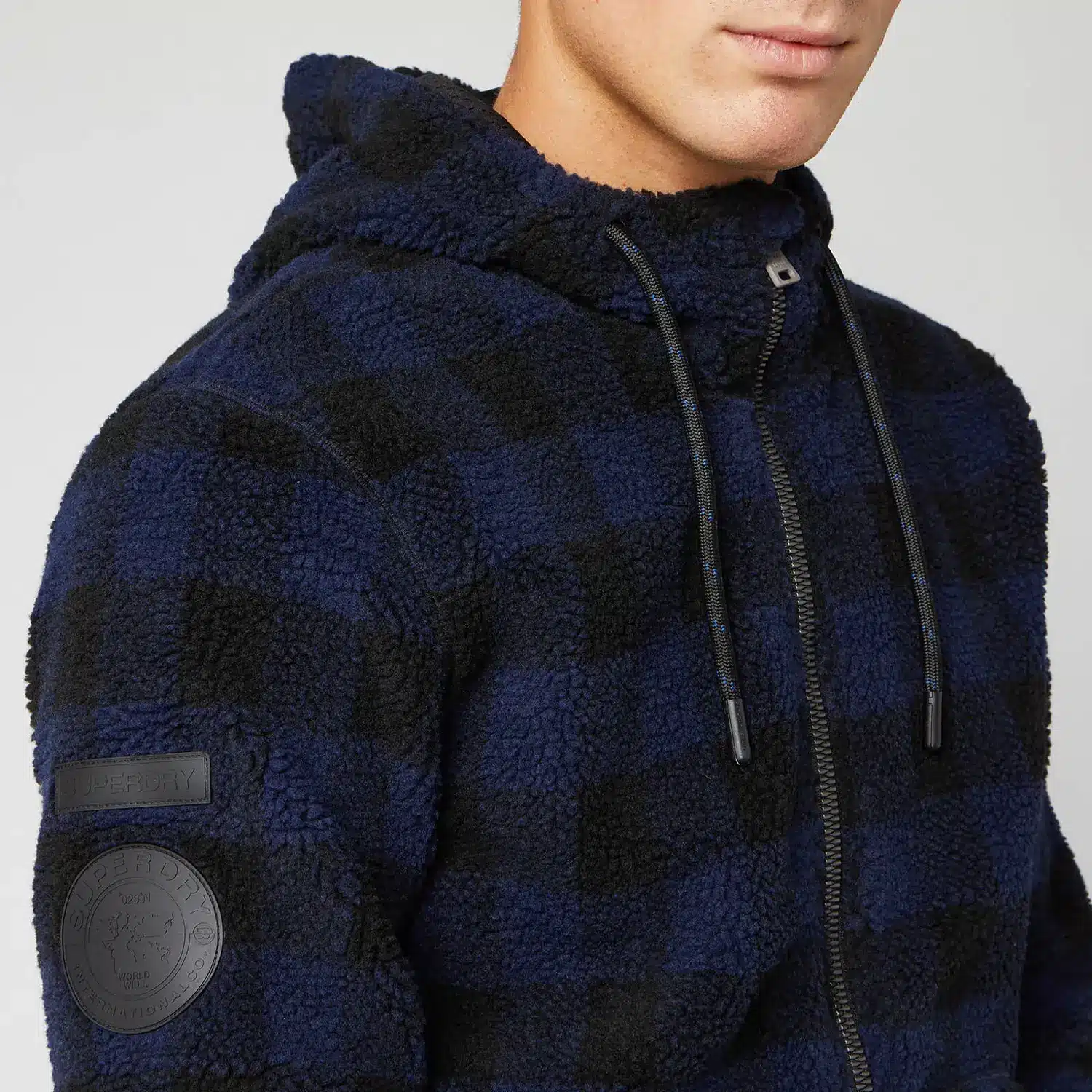 Felpa blu navy con cappuccio e zip in stampa check in caldo tessuto effetto pile della collezione AI/19 di Superdry. Cappuccio regolabile con coulisse, tasca a marsupio divisa e finiture a costine a contrasto su polsini e orlo. Patch logo in ecopelle sulla parte superiore del braccio sinistro e ricamo del marchio sulla tasca. Collo alto con patta protettiva con zip al collo.